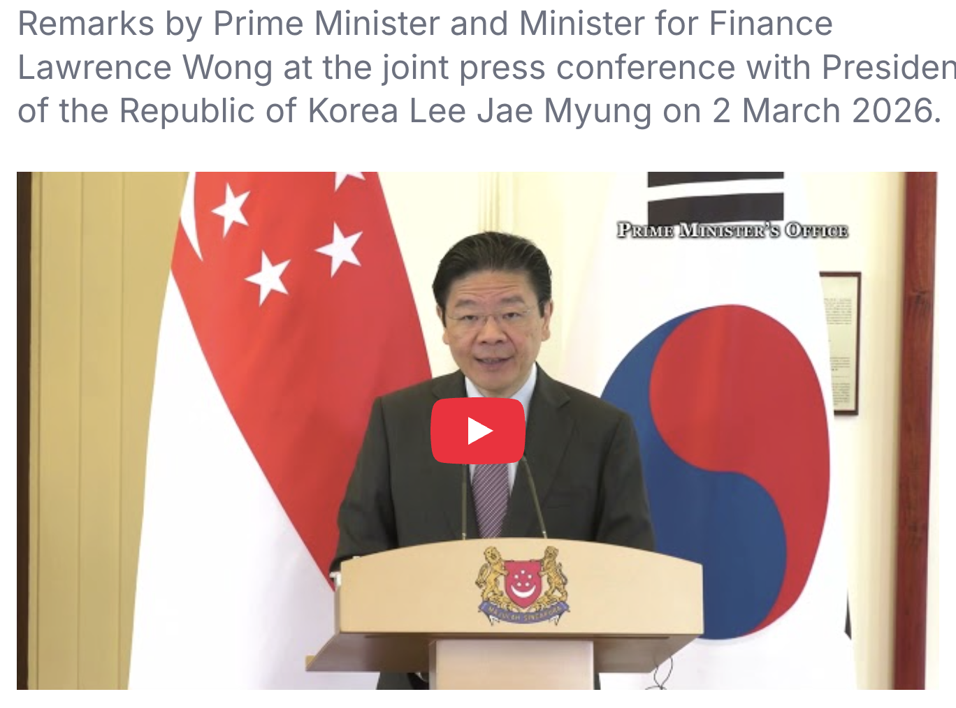 - 싱가포르 총리실 공식 홈페이지, (2026.3. 2). PM Lawrence Wong at the joint press conference with President of the Republic of Korea Lee Jae Myung, https://buly.kr/FAfItM6